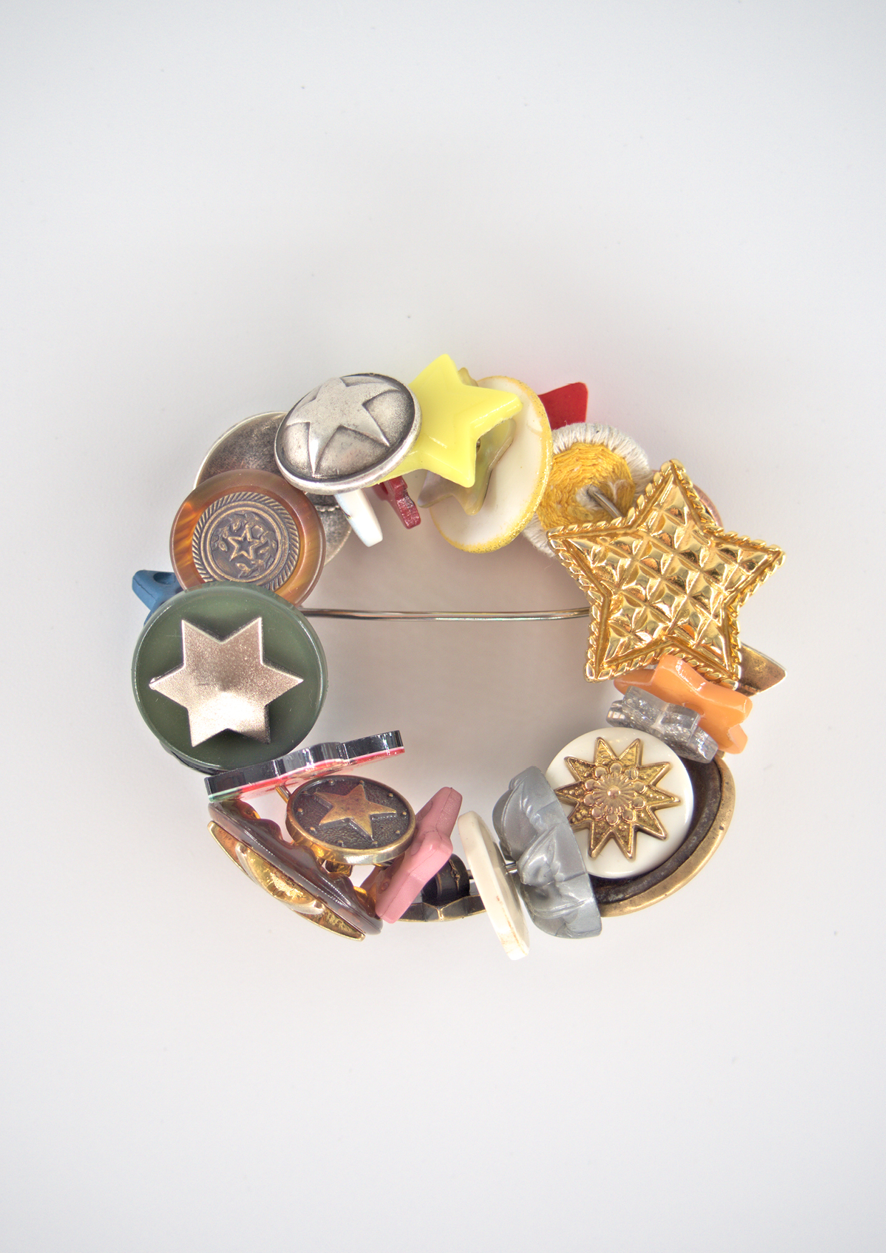 / brooch - buttons: plastic, epoxy, various metals, shell, mother of pearl, flax thread, remanium. /