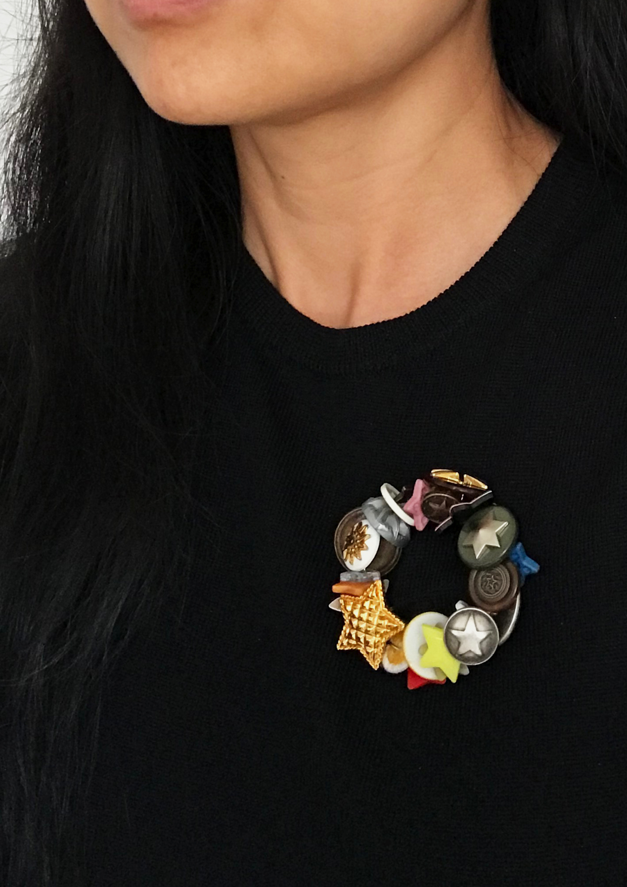 / brooch - buttons: plastic, epoxy, various metals, shell, mother of pearl, flax thread, remanium. /